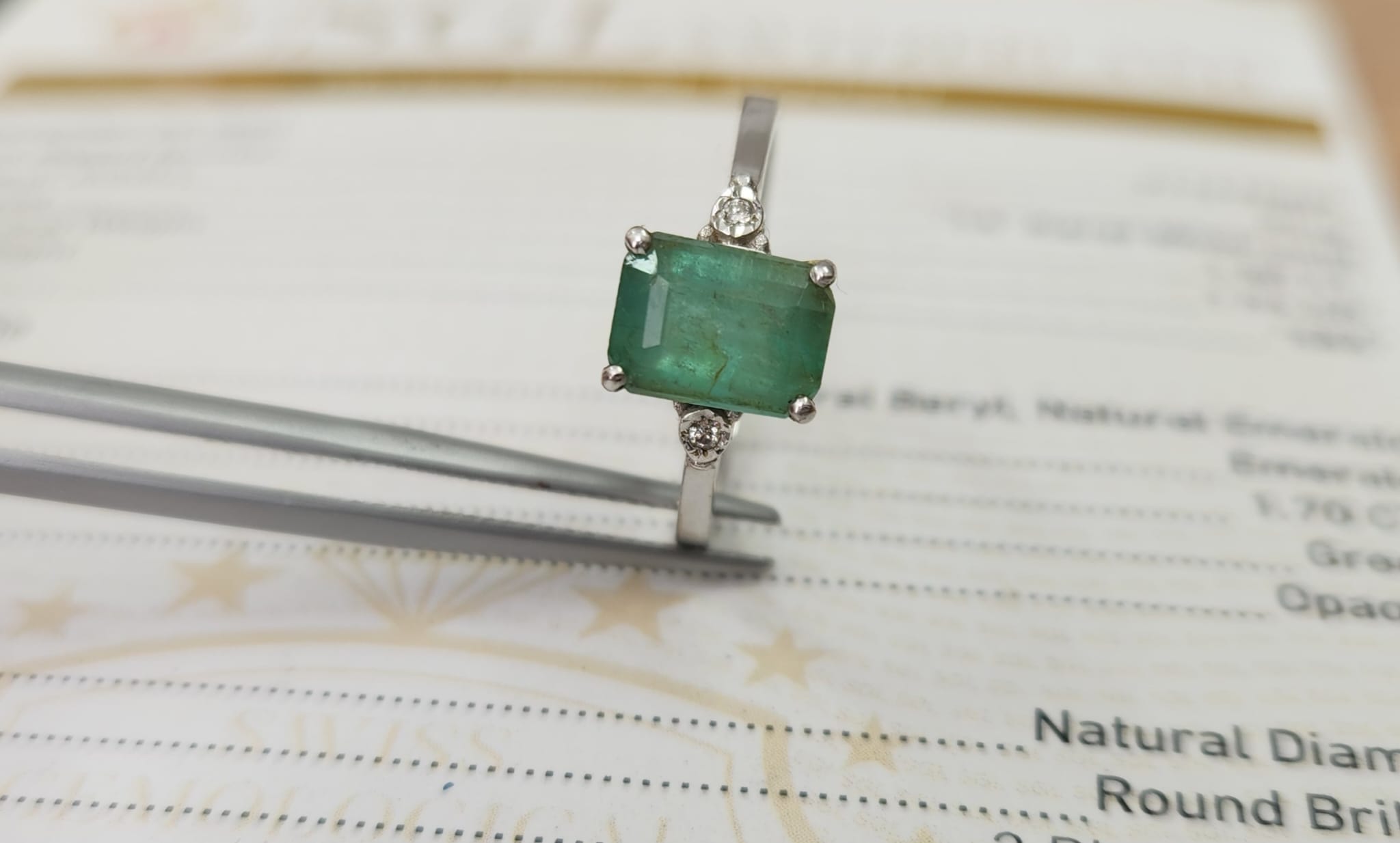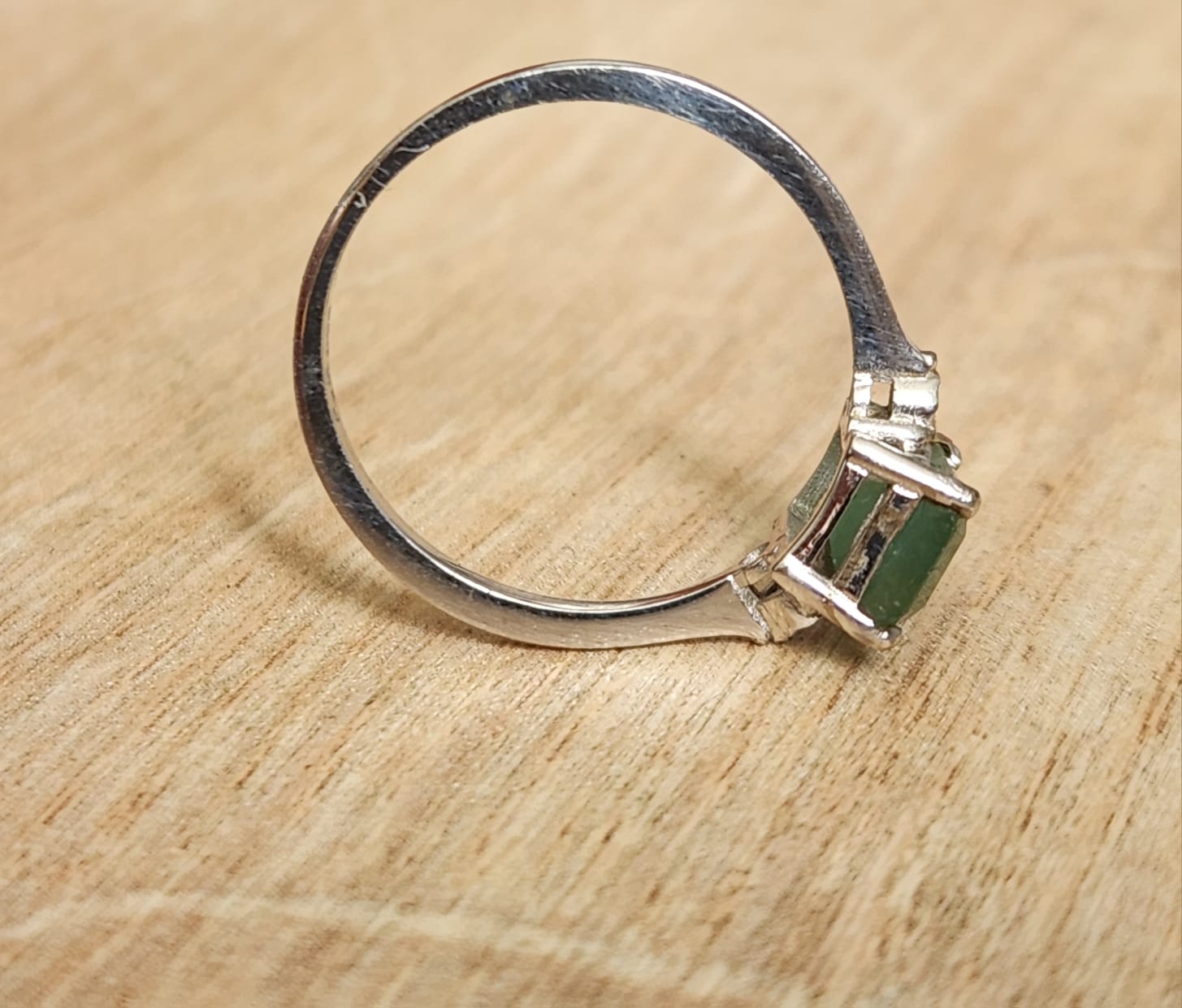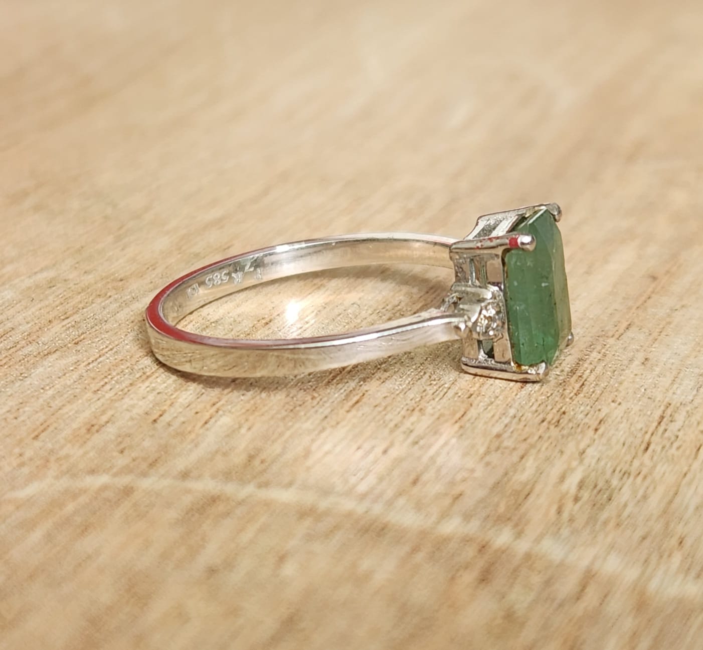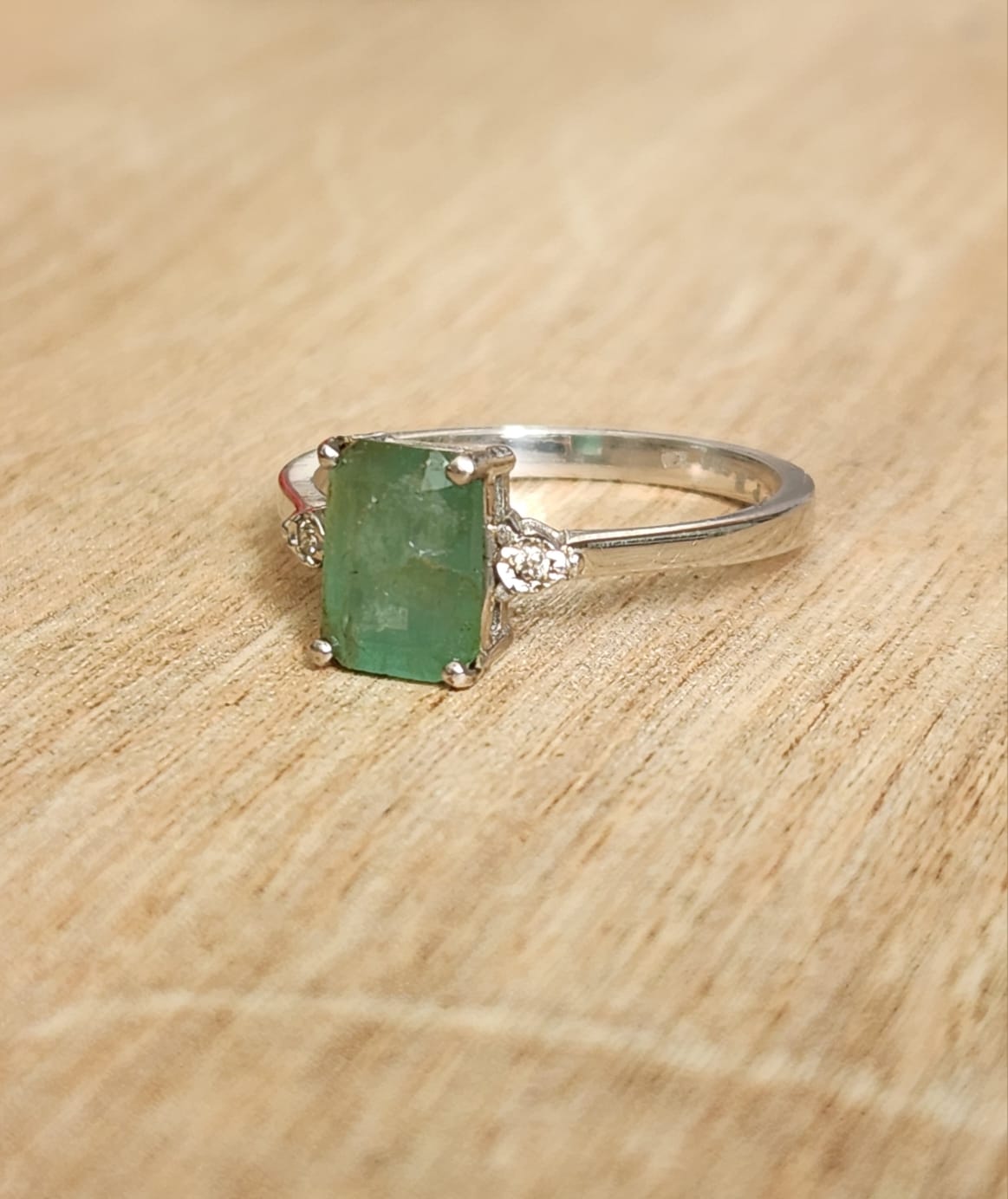 טבעת זהב 14 זהב לבן משובצת באמרלד טבעי ויהלומים טבעיים בצדדים